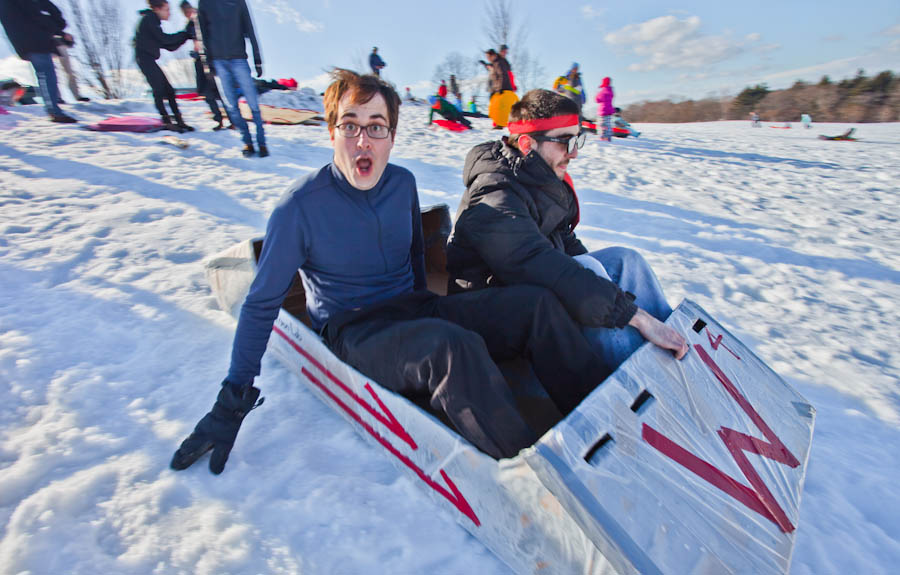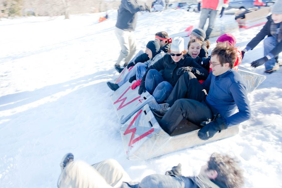 Needless to say, we accepted the challenge. After a couple of weeks of careful planning and team meetings, the Wilson lab built four beautiful sleds out of sheet plastic and heavy cardboard that were clearly aerodynamic, slick and sturdy enough to go head-to-head with a classic Flexible Flyer.